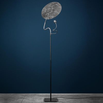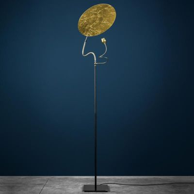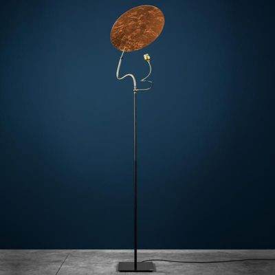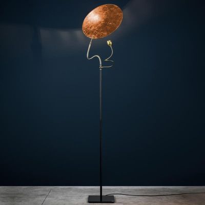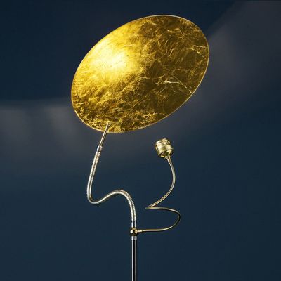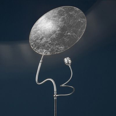 Bij de Luce d' Oro F vloerlamp met gouden, zilveren of koperen schijf kan door het flexibele deel op de staander geheel naar eigen smaak gevormd worden.