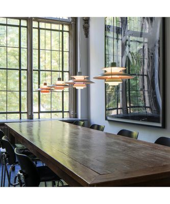 De PH 5 hanglamp is ontworpen om laag boven een tafel te worden gehangen, terwijl hij tevens gedempt licht naar de omgeving uitstraalt.